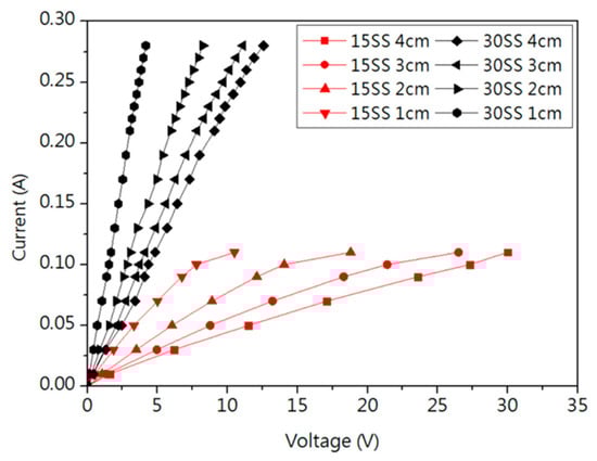 Figure 4a shows the I-V curve, where the dynamic resistance was measured in the linear region. Figure 4b shows that the resistance of 15SS is higher than that of 30SS, primarily due to its smaller cross-sectional area. Under the same applied voltage, this results in a higher resistance. The greater Joule heating effect induced by the higher resistance causes the fuse current (FC) of 15SS at a 4 cm length to be lower than that of 30SS, as shown in Table 1.