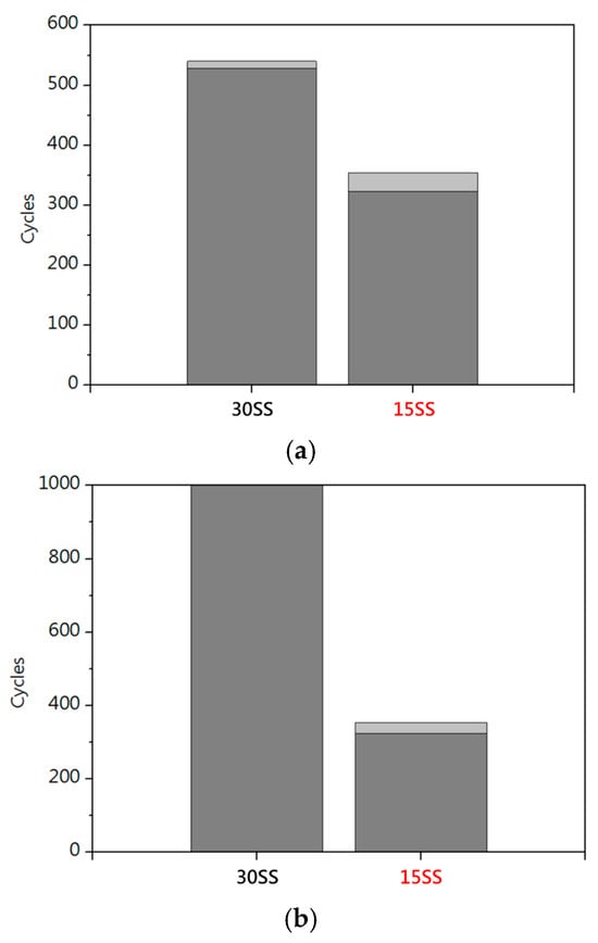 Figure 6a shows the electrical fatigue tests conducted at 80% fuse current of each wire (15SS: 0.08 A, 30SS: 0.22 A). Figure 6b shows the electrical fatigue tests based on the 80% fuse current of 15SS (0.08 A). Due to its lower resistance, 30SS generates less Joule heating under long electrical loading, resulting in superior electrical fatigue life. Notably, both wires exhibit better electrical fatigue performance compared to Cu wires (30SS: 528 cycles/15SS: 339 cycles/Cu wire: 100 cycles) [14].