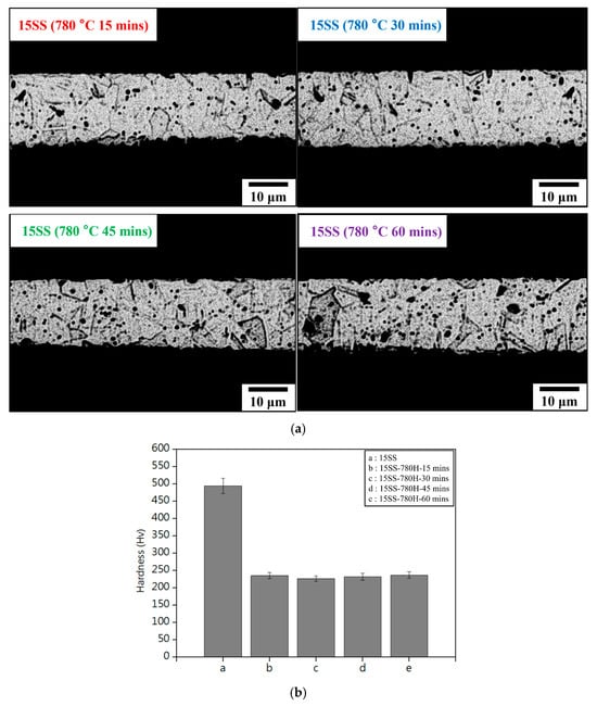 15SS-780H annealed for 15, 30, 45, and 60 min (a) microstructure; (b) micro-hardness.