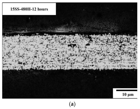 Figure 8a presents the microstructure of 15SS after vacuum annealing at 480 °C for 12 h (15SS-480H-12 h). Figure 8b compares the hardness of 15SS and 15SS-480H-12 h, showing that annealing transformed the elongated grains into equiaxed grains. However, in contrast to 15SS-780H, the grain structure exhibited no significant changes after long-duration low-temperature annealing, and there was no observable reduction in hardness at 480 °C. In other words, in this study, 304L stainless steel wires annealing at 480 °C after work hardening do not induce recrystallization. This is attributed to the strain-induced martensitic transformation (SIMT) in austenitic stainless steel, where extensive cold working promotes martensite formation and high dislocation density, leading to increased hardness [15]. Therefore, a sufficiently high annealing temperature is required to transform martensite back into austenite.