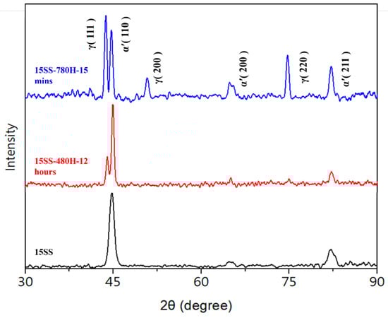 Additionally, the literature on 304 stainless steel indicates that after cold working, hardness increases, and annealing at 200 °C, 300 °C, or 450 °C fails to induce recrystallization or phase transformation, preventing any significant reduction in hardness (whereas conventional steels typically exhibit tempering softening) [16]. To verify this, X-ray diffraction (XRD) analysis was conducted on the original wire and the two vacuum-annealed wires. Figure 9 presents the XRD results of the three wire samples, revealing a significant presence of the martensite phase in 15SS. This aligns with the previous literature, which states that extensive cold working induces the SIMT phenomenon in austenitic stainless steel, leading to martensite formation (whereas conventional 304 stainless steel is fully austenitic). Notably, the martensite peak in 15SS-480H-12 hrs remains higher than the austenite peak, indicating that annealing at 480 °C is insufficient to revert martensite to austenite. The literature reports that annealing deformed 304 stainless steel at 500 °C results in a martensite content of up to 70 wt.%, which is consistent with the findings of 15SS-480H-12 hrs [17]. In contrast, the highest peak in 15SS-780H-15 min corresponds to the austenite phase, demonstrating that annealing at 780 °C effectively reverts martensite to austenite, leading to a reduction in hardness. Additionally, the literature suggests that annealing austenitic stainless steel at 800 °C can nearly eliminate deformation-induced martensite, corroborating these results [18]. Based on these findings, this study selects the 780 °C, 15 min annealing condition as a reference parameter for determining the required current in the subsequent in-line electrical annealing process.