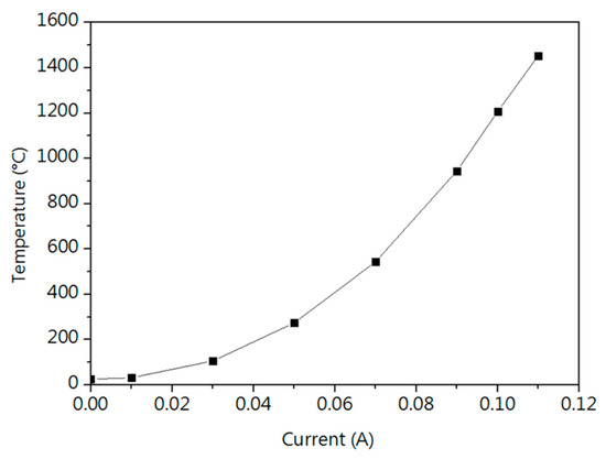 Figure 10 shows the relationship between electrical current and induced temperature for 15SS, calculated by Equation (1).