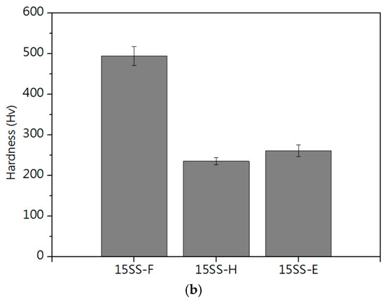 Figure 7a presents the microstructure of 15SS after vacuum annealing at 780 °C for 15, 30, 45, and 60 min. The annealed wires (15SS-780H) exhibited more equiaxed grains with increased grain size, while the original elongated grain structure disappeared. Figure 7b compares the hardness of 15SS and 15SS-780H, showing that annealing at 780 °C for 15 min significantly reduced hardness from 494 Hv to 235 Hv. However, extending the holding time beyond 15 min did not result in further hardness reduction.