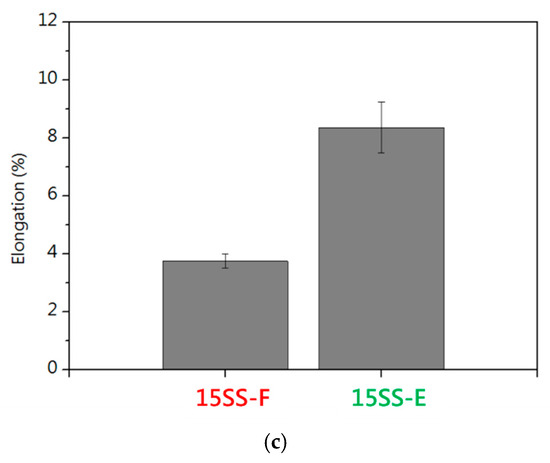 Tensile properties of 15SS-F and 15SS-E: (a) stress–strain curves; (b) tensile strength; and (c) elongation.