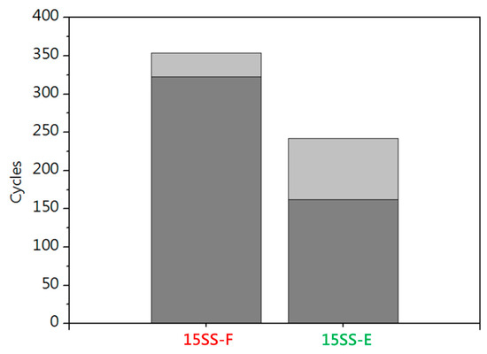 Figure 14 compares the electrical fatigue life of 15SS-F and 15SS-E, revealing a decline in fatigue performance for 15SS-E. This reduction can be attributed to two factors. One is the electrified annealing current (0.08 A), while the resistance of 15SS-E exceeded that of 15SS-F at currents above 0.05 A. As a result, the Joule heating effect during electrical fatigue testing was more pronounced, causing the wire temperature to rise more rapidly toward the fuse temperature. The other is the homogenization effect. 15SS-F underwent extensive cold working, accumulating a high level of stored energy, contributing to its superior electrical fatigue life of up to 300 cycles. During electrified annealing, part of this stored energy was released, promoting grain uniformity. Consequently, while 15SS-E exhibited lower strength and improved ductility, its electrical fatigue life was reduced.