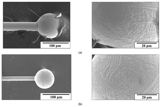 Figure 15a,b present SEM images of 30SS and 15SS-F after the EFO process, confirming that 304 stainless steel fine wires can successfully undergo discharge ball formation. The images also reveal the presence of extensive dendritic structures on the surface of FAB. Figure 16a further illustrates that the ball microstructure consists of columnar and dendritic grain structures. According to the literature, the solidification behavior of 304 stainless steel is influenced by the Creq/Nieq, which can be determined using the following equations: [22,23,24,25]
