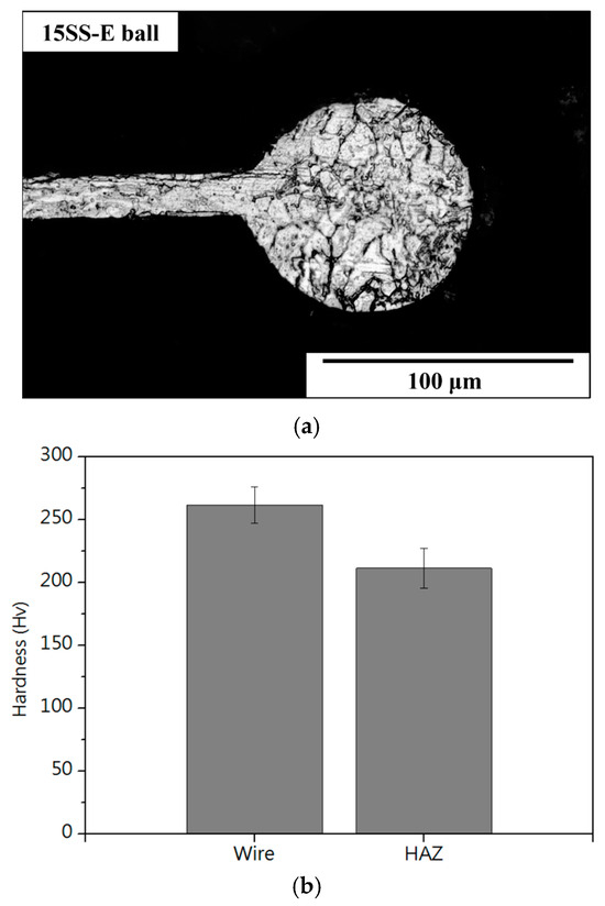 Figure 16b and Figure 18b compare the hardness of the two wires and their respective ball formations, while Figure 20a,b present hardness measurements in the heat-affected zone (HAZ). The results indicate that the HAZ length for the original wire (15SS-F) ranges from 180 to 210 µm, whereas, for the electrically annealed wire (15SS-E), it is reduced to 150–180 µm. By averaging the hardness values of the HAZ and comparing them with the wire and ball hardness (Figure 21), it was confirmed that both 15SS-F and 15SS-E exhibit higher hardness than the FAB and HAZ area. This is due to the high-temperature melting and rapid solidification during discharge ball formation, which results in a large-grained FAB and HAZ area. Additionally, after electrical annealing, the hardness of the wire, ball, and HAZ significantly decreased, further demonstrating the superior ball-forming characteristics of electrically annealed stainless steel fine wires.