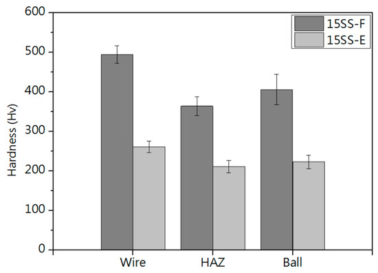Comparison of micro-hardness in wire, HAZ, and FAB for 15SS-F and 15SS-E.