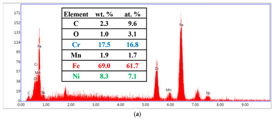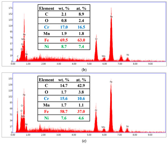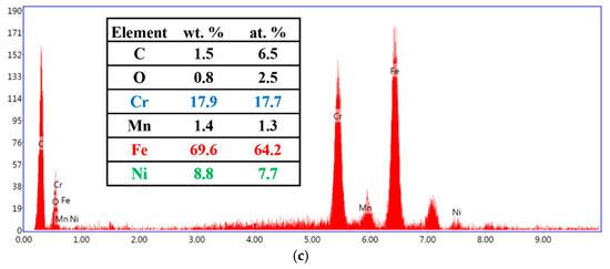 Elemental analysis of 15SS-F: (a) wire; (b) HAZ; and (c) FAB.