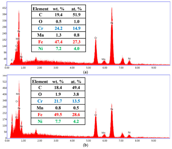In the equations, [A] represents wt.% of element A. Using Equations (8) and (9), the Creq/Nieq for 304 stainless steel is calculated to be 1.77, corresponding to an AF-mode solidification behavior. In AF-mode solidification, the surface of 304 stainless steel tends to form a skeletal ferrite structure. However, when the cooling rate during solidification exceeds a critical threshold, the solidification mode transitions to FA mode, where the surface preferentially precipitates the austenite phase, forming a dendritic grain structure.