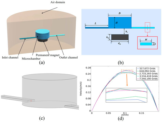 Using a three-dimensional finite element software COMSOL 6.0 model to solve the governing partial differential equations, the model of this paper uses the COMSOL physics field laminar flow module magnetic field (no current), and particle tracking module. Figure 1a,b show the simplified model for the magnetic particle capture motion characterization study. The model is divided into five computational domains, with flow field and particle calculations in the inlet channel, cavity, and outlet channel regions, and magnetic field calculations in all regions. The flow distribution of the fluid is obtained by solving the Navier–Stokes equation, and the flow dynamics boundary is no-slip. The boundary condition of the outlet is set to pressure (the static pressure is 0 Pa). The boundary of the air domain is set to zero standard magnetic potential, with a radius of 20 mm and a height of 24 mm. A tetrahedral mesh is used for the three-dimensional model. The pseudo time step for the transient solver is 0.00001 s. Considering that the library mixing solution after preparation is about 50 μL, and the amount of magnetic particles solution is 30 μL, the volume of the cylindrical microchamber for magnetic particle processing should be more than 80 μL, so the diameter of the microchamber is D = 6 mm and the height is H = 3 mm. The inlet is located on the left side of the chamber, with a width and a height of w = 1 mm and h = 0.2 mm, The fluid needs to be fully stabilized after entering the microchannel, and therefore the channel length can be chosen as long as 3 mm. The magnetic source utilized is a NdFeB magnet with a diameter and height of dm = 5 mm and hm = 1.5 mm. This magnet is chosen because of its small size and high magnetic field strength and gradient. And hc indicates the distance between the magnet and the microchamber, with hc = 1.5 mm for initial conditions. The outlet is located on the right side of the microchamber and has the same parameters as the inlet.