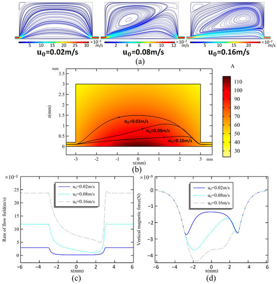 (a) Flow profiles of the microchamber at inlet flow rates u0 of 0.02 m/s, 0.08 m/s, and 0.16 m/s. (b) Magnetic field distribution in the microchamber and trajectory of the center streamline when u0 = 0.02, 0.08, and 0.16 m/s. (c) Rate changes on the streamline. (d) The simulated magnetic force on a magnetic particle when moving along the streamline.