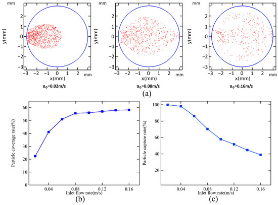 The process of capturing magnetic particles is simulated for flow rates ranging from 0.02 m/s to 0.16 m/s. Figure 3a illustrates the distribution of 1000 magnetic particles released from the inlet. Figure 3b,c show the particle coverage rate, which reflects the area covered by magnetic particles relative to the total area of the microchamber’s bottom, and can be obtained as follows: