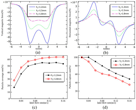 (a) Vertical magnetic force and (b) horizontal magnetic force on the bottom surface when hc = 1.2, 1.5, and 1.8 mm. Effect of u0 on (c) particle coverage rate and (d) particle capture rate when hc = 1.2 and 1.8 mm.