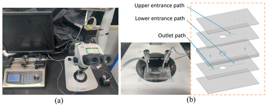 Microfluidic experiment bench. (a) Experimental equipment. (b) Microfluidic chip.