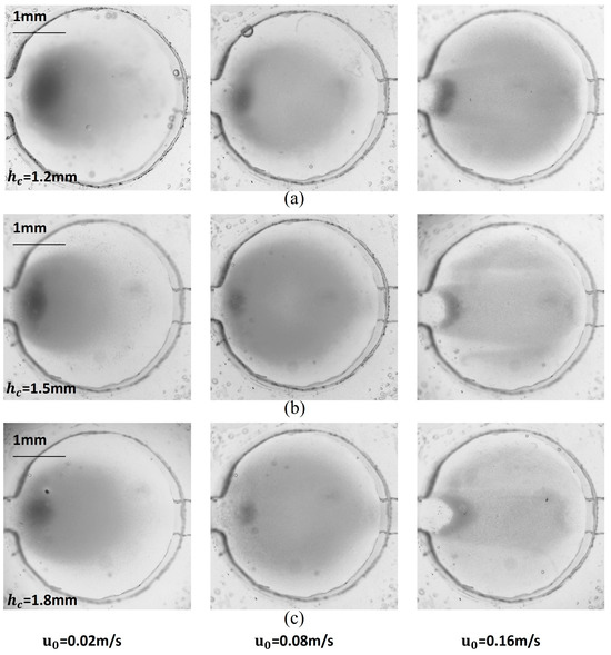 Image of capture results for magnetic particle solution with 0.05% mass fraction when hc = (a) 1.2 mm, (b) 1.5 mm, and (c) 1.8 mm.