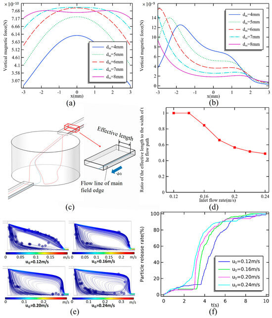 The trajectories of magnetic particles are closely aligned with the streamlines that originate at the bottom of the inlet. However, not all streamlines that start at the inlet lead directly to the exit. The streamline that begins below the inlet side creates a complex flow trajectory. Magnetic particles entering this region will also circulate within the vortex field, following the path of the streamline. Since streamlines do not intersect, the streamline nearest to the vortex field also serves as the boundary streamline of the main flow field. The distance between the starting points of the left and right boundary streamline is referred to as the effective length of the inlet width. Figure 9c,d illustrate the relationship between effective length and inlet flow rate, with flow rates ranging from 0.02 m/s to 0.24 m/s. When the flow rate is less than 0.14 m/s, the effective length is equal to the inlet width. However, at a flow rate of 0.16 m/s, the effective length decreases to 84.6% of the inlet width, as some of the streamlines begin to enter the vortex field. As the inlet flow rate continues to increase, the effective length continues to diminish, although the rate of decrease slows with rising flow rates. At an inlet flow rate of 0.24 m/s, the effective length is only 48.8% of the inlet width.