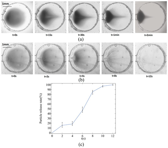 In Figure 10c, the release rate of particles shows a slow–fast–slow trend, which is similar to the simulation curve to a certain extent. However, the experimental curve has a small change amplitude. This is because particles not only move in a plane in the cavity, but they also leave the microscope focal plane when they move upward, making it difficult to capture particle images.