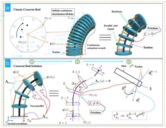 It was assumed in Equation (9) that the tendon driving wrench function is continuous and the friction is negligible. Under these assumptions, the tendon driving wrench remains uniformly continuous at any position along the tendon, and the tension is identical throughout the tendon length, as illustrated in Figure 1a. However, in practical applications, disks are typically installed on the backbone at either equal or unequal intervals, causing the tendon to form piecewise linear segments between adjacent disks. The distance of these segments from the backbone is not constant. To address this discrepancy and better approximate the actual physical model, a series of studies was conducted in this work.