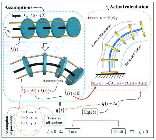 However, for the currently derived equation, the sign of cannot be directly determined. To address this, an algorithm is implemented to perform the relevant computations, with the process illustrated in Figure 2. At the initial instant of time t, the total length of the tendon and the corresponding generalized coordinates are known. Under the influence of the tendon driving force , the system transitions to a new configuration. At this stage, it is necessary to iterate through all the possible tendon length combinations for the TDCR at an instant of time . In each iteration, is assumed, and this assumption is substituted into the TDCR system model to calculate the new generalized coordinates . Subsequently, by comparing the values of between an instant of time t and , and incorporating Equation (25), the correctness of the assumption is evaluated. This process determines the sign of for each tendon.