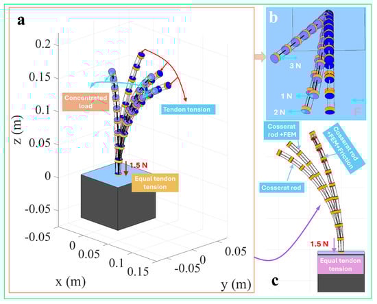 A comprehensive evaluation of the simulation results for four tendon-routing (single-segment/parallel, two-segment, helical, and convergent) and three modeling approaches (classical Cosserat rod continuous force, discrete concentrated force, and friction-inclusive discrete concentrated force) reveals consistent trends. Regardless of the routing or segment configuration, the classical Cosserat rod model predicts the most significant overall deformation, followed by the discrete concentrated force model, while the friction-inclusive discrete concentrated force model exhibits significantly reduced deformation predictions. The helical routing demonstrates the ability to achieve high degrees of spatial deformation using a single wound tendon without requiring additional actuation sources. In contrast, the convergent routing offers advantages in end-effector size control but exhibits more pronounced local friction and nonlinear effects. Comparative analyses were conducted under varying external concentrated loads to investigate the coupling effects of tendon force and external loads further. However, these findings remain at the numerical simulation stage. Experimental validation is required to confirm these conclusions’ effectiveness and practical applicability.