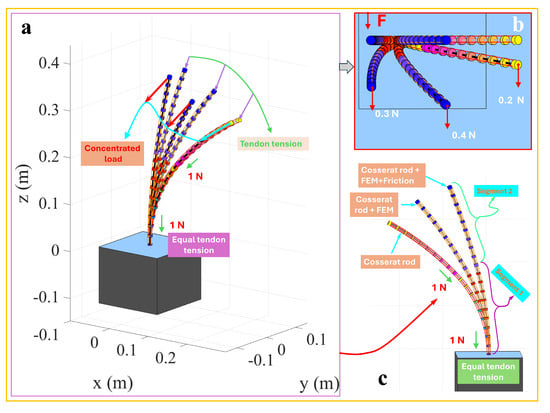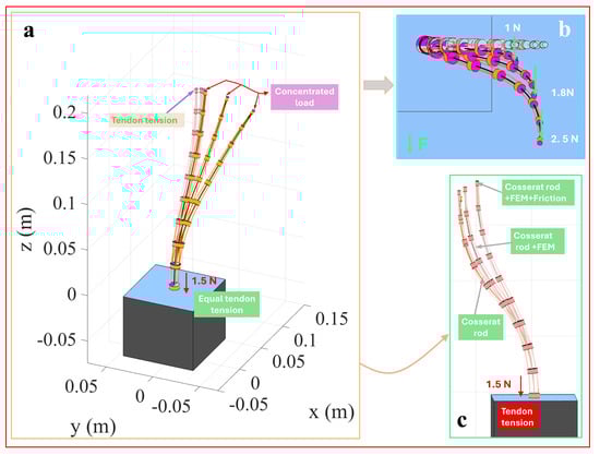 In complex application scenarios, a TDCR often requires multi-segment structures to apply concentrated loads at different nodes and perform more flexible operations. To address this, the single-segment TDCR was extended to a two-segment structure for simulation. Each segment had a length of 200 mm, resulting in a total length of . Three tendons were arranged per segment with equal angular spacing and an offset distance of , while the other material parameters remained consistent with the single-segment model. This setup reflected the complexity of multi-segment structures while maintaining parameter comparability. Figure 4a shows the overall deformation of the two-segment TDCR under the combined action of 1 N tendon tension and an external concentrated load. The green arrows indicate the deformation path driven solely by tendon forces, while the cyan arrows depict the additional deformation resulting from the applied concentrated load. Figure 4b presents a close-up top view, illustrating that, as the concentrated load increases from to , the overall deformation also increases, indicating higher sensitivity of the multi-segment structure to coupled deformations at the end and along its segments. As shown in Figure 4c, comparing the classical Cosserat rod model, the discrete concentrated force-driven model, and the discrete concentrated force-driven model incorporating friction reveals consistent trends. Under identical tendon forces, the classical Cosserat rod model predicted the most considerable deformation magnitude, while the discrete concentrated force-driven model showed reduced deformation. When friction effects were included, the deformation further decreased. These results demonstrate consistent deformation patterns between multi- and single-segment TDCRs under external concentrated loads.