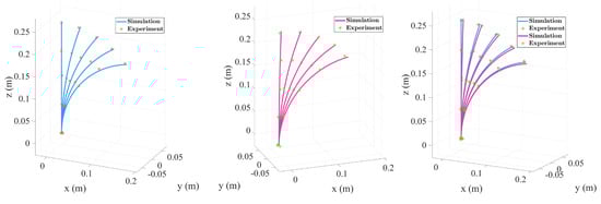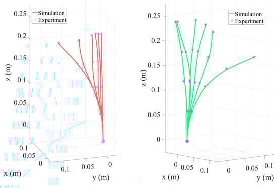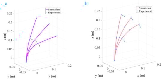 This study conducted experimental research on a two-segment TDCR with collinear tendons to investigate the coupling effects between different tension combinations, concentrated loads, and end deformation and the system’s compliance. This study also aimed to evaluate the accuracy and applicability of the simulation model. Table 2 summarizes the experimental data, and deformation visualizations under various conditions are shown in Figure 9. Figure 9a illustrates the bending shape under actuation by the first segment’s tendons without concentrated loads. The maximum deviation between the experimental measurements (marked with asterisks) and simulation predictions (curves) was 0.16%, indicating that the model accurately captured the bending behavior of the two-segment structure under low-load conditions. However, when a concentrated load was applied to the second segment (Figure 9b), the end bending angle increased significantly, and the maximum deviation rose to 0.3%.