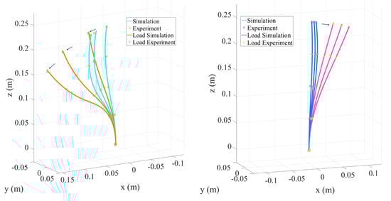 The experimental and simulation results are compared in Table 1, with data visualizations presented in Figure 8. Figure 8 illustrates the bending shape induced solely by tendon tension without external concentrated loads, while Figure 8 depicts the bending shape after applying a concentrated load at the end. Figure 8 overlays the two conditions for direct comparison. Under no-load conditions, the experimental data (marked with asterisks) showed a maximum deviation of approximately 0.2% from the simulation results (curves), indicating the high predictive accuracy of the simulation model under low-load scenarios. However, after applying the concentrated load, the experimental results revealed a significant increase in the bending angle, with the deviation between the simulation and experiment rising to 0.25%. This increased deviation was primarily attributed to the amplifying effect of external loads on tendon tension, material nonlinearity, and the greater significance of frictional forces at higher tensions.