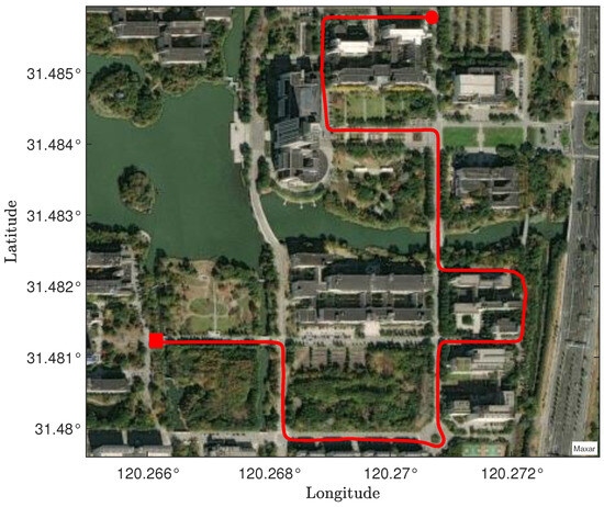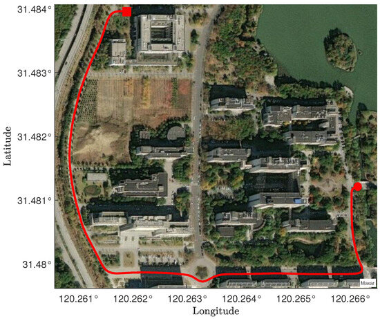 To evaluate the performance of the CRSFIR filter in trajectory tracking, we conducted an experiment focused on tracking the trajectory of a moving vehicle. The experiment comprises two distinct trajectory segments. The first segment features fewer turns and primarily consists of straight–line motion, with minimal surrounding buildings. In contrast, the second segment involves more frequent turns and a higher density of surrounding buildings, creating a more complex environment. A GNSS processing unit is responsible for parsing the transmitted satellite signals to obtain precise location data. The sampling interval during the experiment is set to 1 s. The raw data collected by the GNSS are initially obtained from the World Geodetic System 1984 (WGS84) coordinate system. To facilitate the evaluation of the filtering algorithm’s performance, WGS84 coordinates are converted to the Earth–centered, Earth–fixed (ECEF) coordinate system. The ECEF is a Cartesian system with three axes, , , and , measured in meters. The experiment uses a simplified trajectory tracking model, with the coefficient matrices being represented as