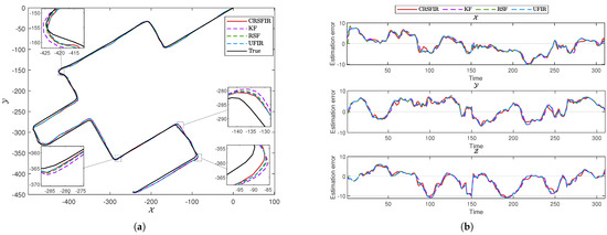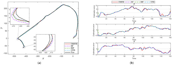 (a) Vehicle trajectories generated by the cumulative risk–sensitive FIR (CRSFIR) filter, Kalman filter (KF), risk–sensitive filter (RSF), and unbiased FIR (UFIR) filter. (b) Estimation error curves generated by the CRSFIR filter, KF, RSF, and UFIR filter along the , , and axes.