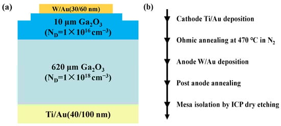 (a) Schematic cross section structure of the fabricated W/Au Ga2O3 SBDs; (b) the fabrication process of the Ga2O3 SBDs.