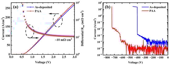 (a) Forward J-V characteristics and (b) reverse BV characteristics of the W/Au Ga2O3 SBDs for the as-deposited sample and the sample with PAA.