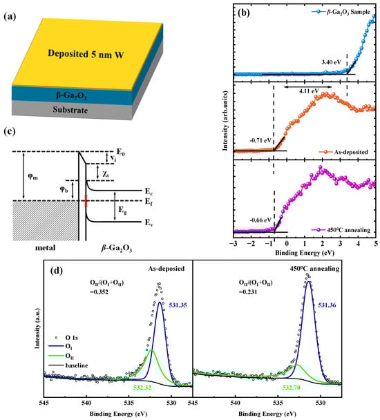 (a) 5 nm thick W metal was deposited on the β-Ga2O3 sample surface; (b) XPS valence band plots for the β-Ga2O3 sample, as-deposited sample with 5 nm W metal film on Ga2O3, and the sample-deposited 5 nm W and annealed for 2 min at 450 °C in N2 atmosphere; (c) the barrier diagram of the metal in contact with β-Ga2O3; (d) the O 1s core level spectra for the sample-deposited 5 nm W and the sample-deposited 5 nm W with 450 °C annealing.