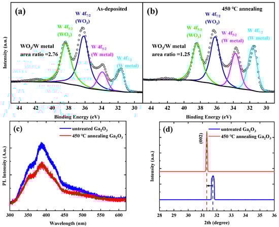 The reduction of oxygen vacancies on the β-Ga2O3 surface can be attributed to two aspects. On the one hand, the W metal has a low chemical affinity (i.e., lower oxide stability and no intermetallic compounds) with Ga2O3, so that WOx oxides are easily reduced to the W native metal during annealing []. Figure 4a and b show the W 4f spectra for the sample-deposited 5 nm W and the sample-deposited 5 nm W with 450 °C annealing. As shown in Figure 4a and Figure 4b, the peaks around 36.1 eV and 31.6 eV are attributed to WO3 and W metal, respectively. The W 4f core level spectra were deconvoluted using a doublet of two Gaussian peaks of equal width corresponding to the W 4f7/2 and W 4f5/2 spin-orbit components []. After annealing, the ratio of WO3 to W metal decreases from 2.76 to 1.25, indicating that WO3 oxides are partially reduced to the W native metal during annealing. Meanwhile, the excess oxygen atoms diffuse into the Ga2O3 material surface in the presence of pure nitrogen, thus reducing the surface oxygen vacancies. On the other hand, during the annealing process in nitrogen atmosphere, the oxygen atoms previously present in the Ga2O3 material interstitial positions have the probability to migrate to the correct position, which can also result in the reduction of oxygen vacancy and the improvement of Ga2O3 material crystal quality []. Figure 4c shows the PL spectra for the untreated Ga2O3 epitaxial material and the Ga2O3 epitaxial material with 450 °C annealing. As shown in Figure 4c, a significant emission peak at about 387 nm and a broad blue-green emission band are observed. In various Ga2O3 materials, the broad 350–620 nm emission band is common, and the origin can be ascribed to the emission recombination of electron and hole pairs between donor-type oxygen vacancy defects and acceptor-type gallium–oxygen vacancy pairs []. The PL emission intensity of the Ga2O3 epitaxial material decreases after annealing, demonstrating that the oxygen vacancies in the Ga2O3 material are reduced after annealing. Additionally, Figure 4d shows the XRD images for the untreated Ga2O3 epitaxial material and the Ga2O3 epitaxial material with 450 °C annealing in nitrogen atmosphere. The XRD results show that the intensity of the (002) diffraction peak (about 31.5°) is enhanced in the Ga2O3 epitaxial material with annealing. This indicates that the crystal quality of Ga2O3 epitaxial material is improved after annealing at 450 °C in N2 atmosphere, and the stress release leads to the location of the (002) peak shift []. These results are consistent with the previous conjectures.