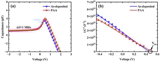 (a) C-V characteristics and (b) 1/C2 versus voltage V plots for the as-deposited sample and the sample with 450 °C PAA.
