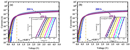 In order to investigate the barrier inhomogeneity of the W/Au Ga2O3 SBDs, the I-V characteristics of the Schottky diodes at varied temperatures ranging from 300 K to 450 K, as shown in Figure 6, were analyzed. A zero-crossing voltage Vzero was observed at 0.85 V in the as-deposited sample and the sample with PAA, which may be due to two different conduction mechanisms in the temperature dependence of the I-V characteristics []. When the forward voltage is below 0.85 V, electron thermionic emission is dominated between the W/Au metal and Ga2O3 contacts, with more electrons acquiring sufficient energy to overcome the Schottky barrier as the temperature rises, leading to an increase in current. Conversely, when the voltage exceeds 0.85 V, electron transport occurs within the drift layer, whereas the current is governed by the mobility of electrons in the drift layer. In this region, as the temperature rises, electron mobility decreases, resulting in a reduction in current.