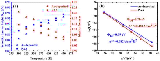 According to Equation (9), the saturation current density Is and the ideality factor η can be extracted from the slope and y-intercept y-intercept and slope of the ln(I)-V plots, respectively. In addition, the barrier height Фb was calculated from Equation (7). As shown in the inset of Figure 6, the barrier height was extracted by selecting a segment of the semi-logarithmic plot (approximately 0.1–0.5 V) within the linear region for linear fitting, from which the slope of the fitted Equation was determined. The obtained average goodness-of-fit metric R2 is very close to 1. Figure 7a shows the barrier height and ideality factor for the as-deposited sample and the sample with PAA as they were extracted at temperatures ranging from 300 K to 450 K. As the temperature increases, the barrier height increases and the ideality decreases, which is attributed to barrier inhomogeneities at the W/Au and Ga2O3 interface. The barrier inhomogeneities exhibited a strong temperature dependence process. At room temperature, carriers primarily cross regions with low barrier heights, often associated with defects at the W/Ga2O3 contact surface, resulting in a large ideality factor. However, as the temperature increased, the carriers gained sufficient energy to cross the higher barrier heights, leading to a smaller ideality factor. Furthermore, conventional Richardson’s plots ln(Is/T2) as a function of 1/kT were plotted for temperatures 300–450 K in Figure 7b. The barrier height qФb,0 and the Richardson constant A** were extracted from the slope and intercept of the linear fit, respectively. For the as-deposited sample, the calculated qФb,0 and A** are 0.69 eV and 0.082 A/cm2K2 respectively, while for the PAA-treated sample, these values are 0.76 eV and 0.481 A/cm2K2. The obtained Richardson constants are several orders of magnitude lower than the theoretical value of A** for β-Ga2O3. This discrepancy arises because the conventional Richardson plot assumes that the barrier height and ideality factor are temperature-independent, which is not valid in the presence of barrier inhomogeneities [].