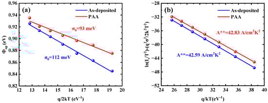 where Фap is the apparent barrier height, Фb0 and σ0 are the mean barrier height and standard deviation, respectively. Figure 8a shows the Фap versus q/2kT plot, and the σ0 was determined with the slope of the fit line. The obtained σ0 values are 112 meV for the as-deposited sample and 92 meV for the sample with PAA. This reduction in σ0 after post-anode annealing is attributed to the reduction of oxygen vacancies, which serve as low-barrier height patches on the W/Ga2O3 contact surface, thereby decreasing fluctuations in the barrier height. Furthermore, a modified Richardson plot was derived using the following Equation: