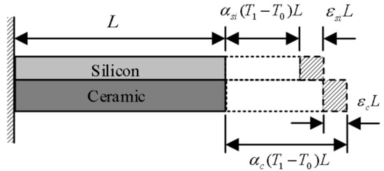 and are the thermal expansion displacement of the silicon vibration beam and the ceramic envelope, respectively. and are their coefficients of thermal expansion. represents the initial temperature, and L represents the initial length. The lengths and express the deviation of the thermal expansion displacement in rigidly bonded silicon and ceramic materials from their free thermal expansion states, resulting from a mismatch in the thermal expansion coefficients under thermal loading.