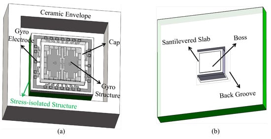 Based on the vibratory shape of the MEMS butterfly gyroscope, the cantilever plate structure is proposed and designed to isolate stress, which is shown in Figure 3. In order to reduce the influence of the thermal stress, the structure is displaced between the ceramic envelope and the gyroscope. The bottom of the structure is attached to the substrate of the ceramic envelope through conductive adhesive, and the top is bonded with the gyroscope through the boss of the cantilever plate, as shown in Figure 3a. The main body of the cantilever plate structure is a cantilever plate fabricated by DRIE (Deep Reaction Iron Etching) on the silicon substrate. In order to make the gyroscope only contact the cantilever plate structure, a boss is designed on the cantilever plate. And a groove is designed on the back of the cantilever plate structure to provide the deformation space for the cantilever plate. The detailed cantilever plate structure is shown in Figure 3b.