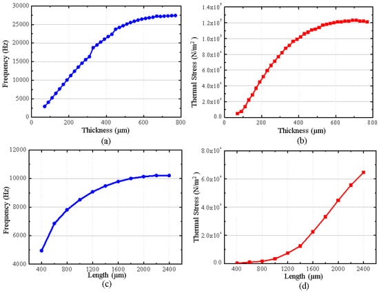 (a) shows the influence regularity of the cantilever plate’s thickness on the resonant frequency. (b) shows the influence regularity of the cantilever plate’s thickness on the thermal stress. (c) shows the influence regularity of the cantilever plate’s length on the resonant frequency. (d) shows the influence regularity of the cantilever plate’s length on the thermal stress.