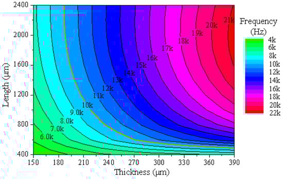 In this simulation, the thermal stress and resonant frequency are the key. The effects of the cantilever plate’s thickness and length on the resonance frequency and thermal stress are simulated as shown in Figure 4.