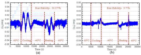 The experimental bias outputs of two gyroscopes in the full temperature range shown in Figure 10 are compensated by using a fourth-order polynomial fitting, and the compensated results are shown in Figure 11. It can be observed that the maximum bias drift of the MEMS butterfly gyroscope without the cantilever plate structure reached 0.054°/s, while the maximum bias drift of the gyroscope with the cantilever plate structure is only 0.022°/s, which is halved compared to the former. Meanwhile, the bias stability of the MEMS butterfly gyroscope without the cantilever plate structure in the full temperature range is 26.27°/h, while that of the MEMS butterfly gyroscope with the cantilever plate structure is 9.7°/h, achieving a performance improvement of approximately 2 times.