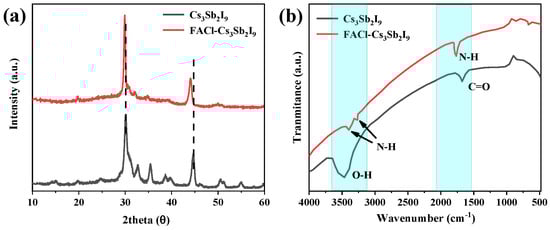 (a) XRD patterns of Cs3Sb2I9 and FACl–Cs3Sb2I9 (b) FTIR spectra of pristine and FACl-treated sample. The peaks at 1764, 3276, and 3402 cm−1 indicate N-H bonds.
