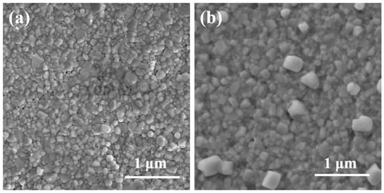 To further characterize the films, an FTIR test was employed. As shown in Figure 1b, the FTIR spectra confirmed the presence of FA in the FACl–Cs3Sb2I9 film, with distinct peaks observed at 1764 cm−1 and 3276 cm−1, corresponding to N-H vibrations. The stretching vibration bond at 1679 cm−1 was attributed to C=O, while the broad peak at 3463 cm−1 in the pristine Cs3Sb2I9 spectra was assigned to O-H. Notably, these peaks (C=O and O-H) disappeared in the FACl-incorporated sample, indicating the successful modification of the film. To verify the incorporation of Cl ions, XPS was conducted. As illustrated in Figure S2, a distinct Cl 2p signal was detected in the FACl-treated film, confirming the presence of Cl within the Cs3Sb2I9 lattice [,]. Moreover, SEM was utilized to analyze the surface morphology of the films. As shown in Figure 2, both pristine and FACl-treated Cs3Sb2I9 films exhibited high surface coverage. However, the FACl-treated film displayed larger grain sizes compared to the pristine film, consistent with previous reports that Cl incorporation promoted grain growth in perovskite films [,,]. This observation further corroborated the successful integration of Cl ions into the Cs3Sb2I9 structure [].