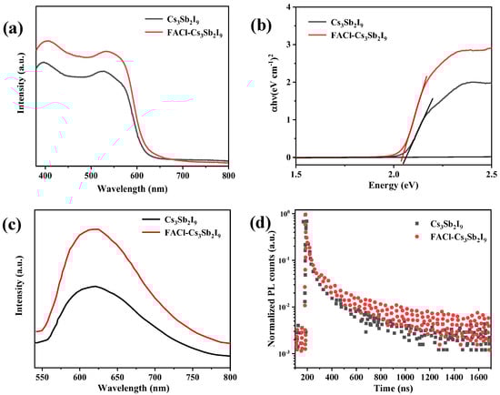 (a) UV–Vis absorption spectra of Cs3Sb2I9 and FACl–Cs3Sb2I9. (b) Band gap of pristine and FACl–Cs3Sb2I9. (c) PL of spectra. (d) Time-resolved PL (trPL) pristine Cs3Sb2I9 (black) and FACl–Cs3Sb2I9 (red).