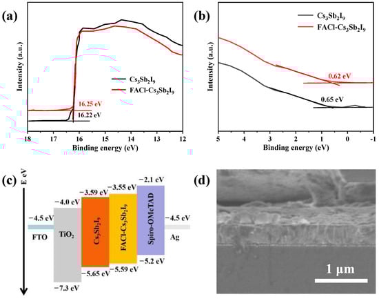 To investigate the impact of FACl incorporation on the energy levels of Cs3Sb2I9, a UPS test was employed. The UPS spectra of both pristine and FACl-incorporated Cs3Sb2I9 films are presented in Figure 4a,b. For the pristine Cs3Sb2I9 film, the high and low binding energy cutoffs were observed at 16.22 eV and 0.65 eV, respectively. Following FACl treatment, these values shifted to 16.25 eV and 0.62 eV, respectively. The conduction band (CB) positions were determined by adding the bandgap values to the valence band (VB) energies. The calculated CB values for the pristine and FACl-incorporated films were 3.59 eV and 3.55 eV, respectively. All corresponding energy-level values are summarized in Figure 4c. The reduced energy gap between the VB and the Fermi level in the FACl–Cs3Sb2I9-based device was anticipated to enhance carrier concentration and hole mobility. Additionally, the upward shift in the energy levels of the FACl–Cs3Sb2I9 film reduces the energy-level mismatch between the absorption layer and the hole transport layer, which is expected to contribute to an increased open-circuit voltage (Voc) in the photovoltaic device [,,]. Figure 4d displays a cross-sectional image of the fabricated device, revealing a total thickness of approximately 450 nm.
