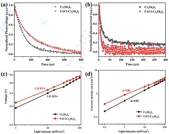 (a) Normalized TPV of pristine and FACl-incorporated sample. (b) Normalized TPC decay of pristine (red) and FACl–Cs3Sb2I9 devices. Light intensity dependence of Voc (c) and Jsc (d) for the Cs3Sb2I9 and FACl–Cs3Sb2I9 device.