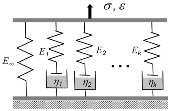 For a general polymer exhibiting linear viscoelasticity (LVE), the viscoelastic behavior under a stress relaxation testing condition can be expressed by the generalized Maxwell model, which consists of viscoelastic chains [7]. A schematic diagram of the generalized Maxwell model is shown in Figure 2. Based on the model, Young’s (or the uniaxial) relaxation modulus, , can be expressed using a Prony series: