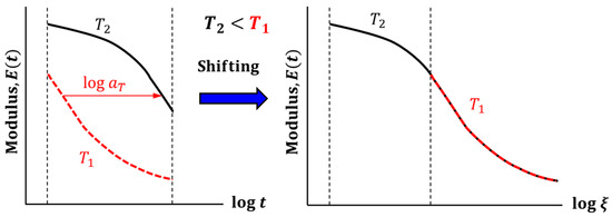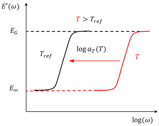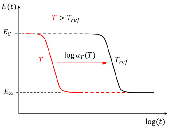 It is well known that, for thermorheologically simple (TRS) polymers, their viscoelastic behavior at one temperature can be related to that at another temperature only by a change in the log time scale. The TRS fundamental is illustrated schematically in Figure 3, where the relaxation modulus at any temperature, , is determined by shifting the master curve (at on a log time scale using a temperature-dependent shift factor, . At any temperature , the relaxation rate is faster (shifted to the left of , while for , the relaxation rate is slower (shifted to the right of